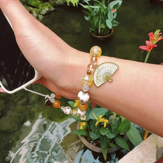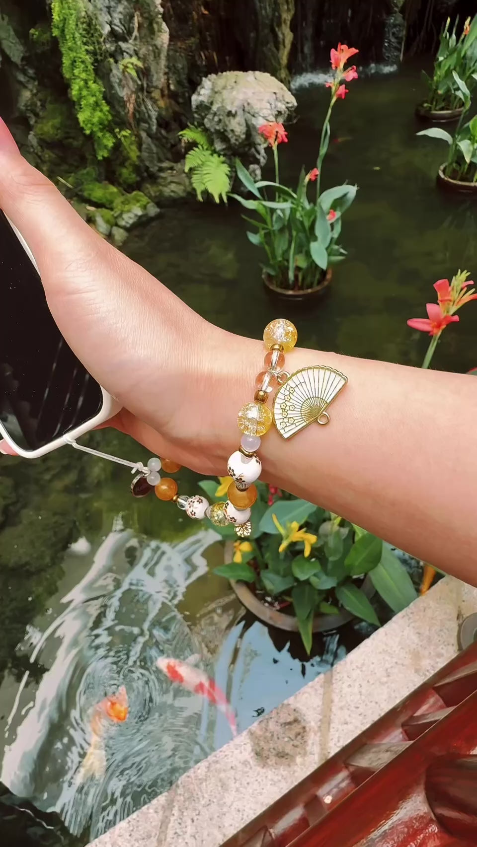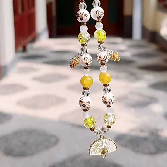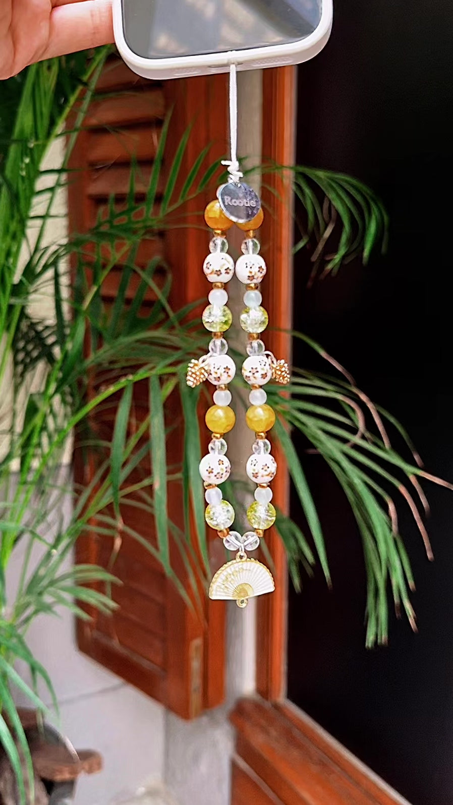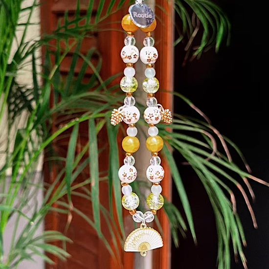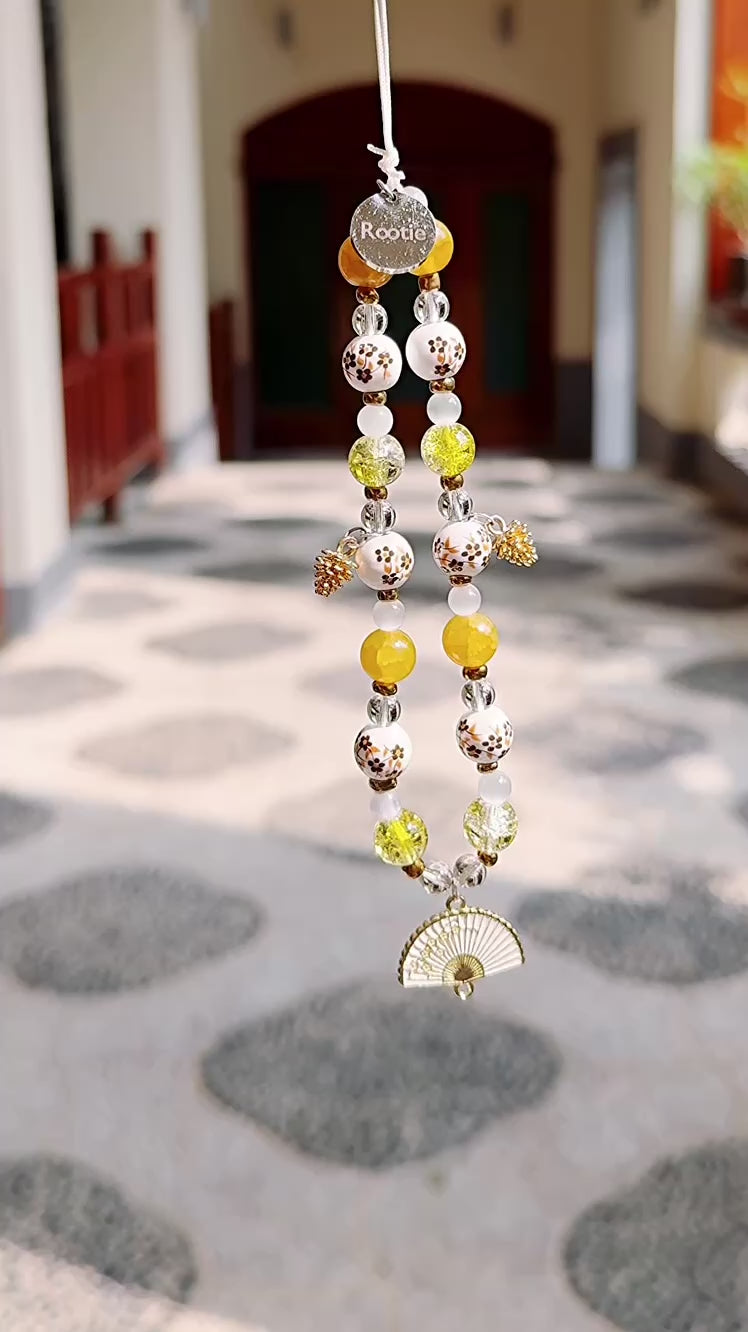 陽光如蜜,輕撫心靈。金松果融匯溫潤文化,展現悠閒韻味。這款吊飾滲透著安寧舒適的心情,交織了東方與西方之美。舞扇與松果邀您步入秋光禪境。🍊🍂🍂材質:玻璃、金屬、陶瓷長度:主飾 15 cm ﹑吊環 7 cm(可能有差異)產品包括:一個吊飾、一個絲質袋和一個禮盒